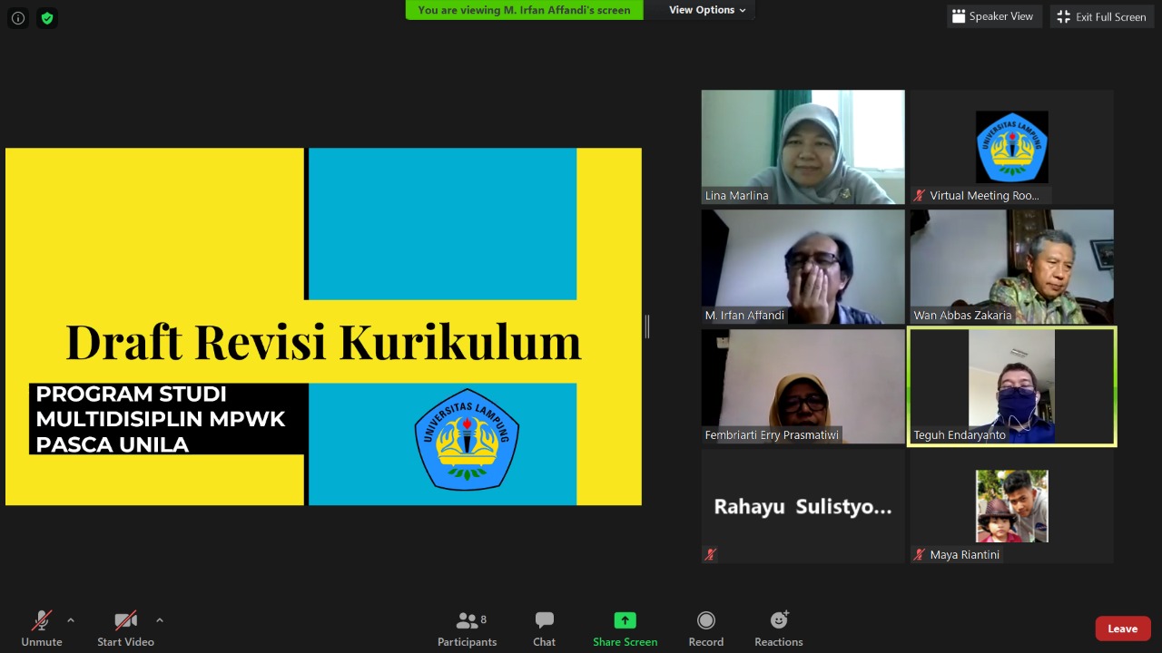 Pada era saat ini perlu adanya pembaharuan kurikulum yang menyesuaikan dengan perkembangan tekhnologi namun tetap memperhatikan kearifan lokal. Pada tanggal 12 Juni 2020 yang lalu PS Perencanaan Wilayah dan Kota mengadakan Focus Grup Discussion (FGD) Kurikulum Internal. Kegiatan ini dilaksanakan sebagai tindak lanjut perubahan kurikulum 2020. FGD ini dibuka secara resmi oleh Direktur Pascasarjana Unila Prof. Dr. Ir. Wan Abbas Zakaria, M.S. dan dihadiri oleh Ketua PS Magister PWK Dr. Ir. Muhammad Irfan Affandi, M.S. , Tim Penjamin Mutu serta dosen-dosen pengampu mata kuliah.