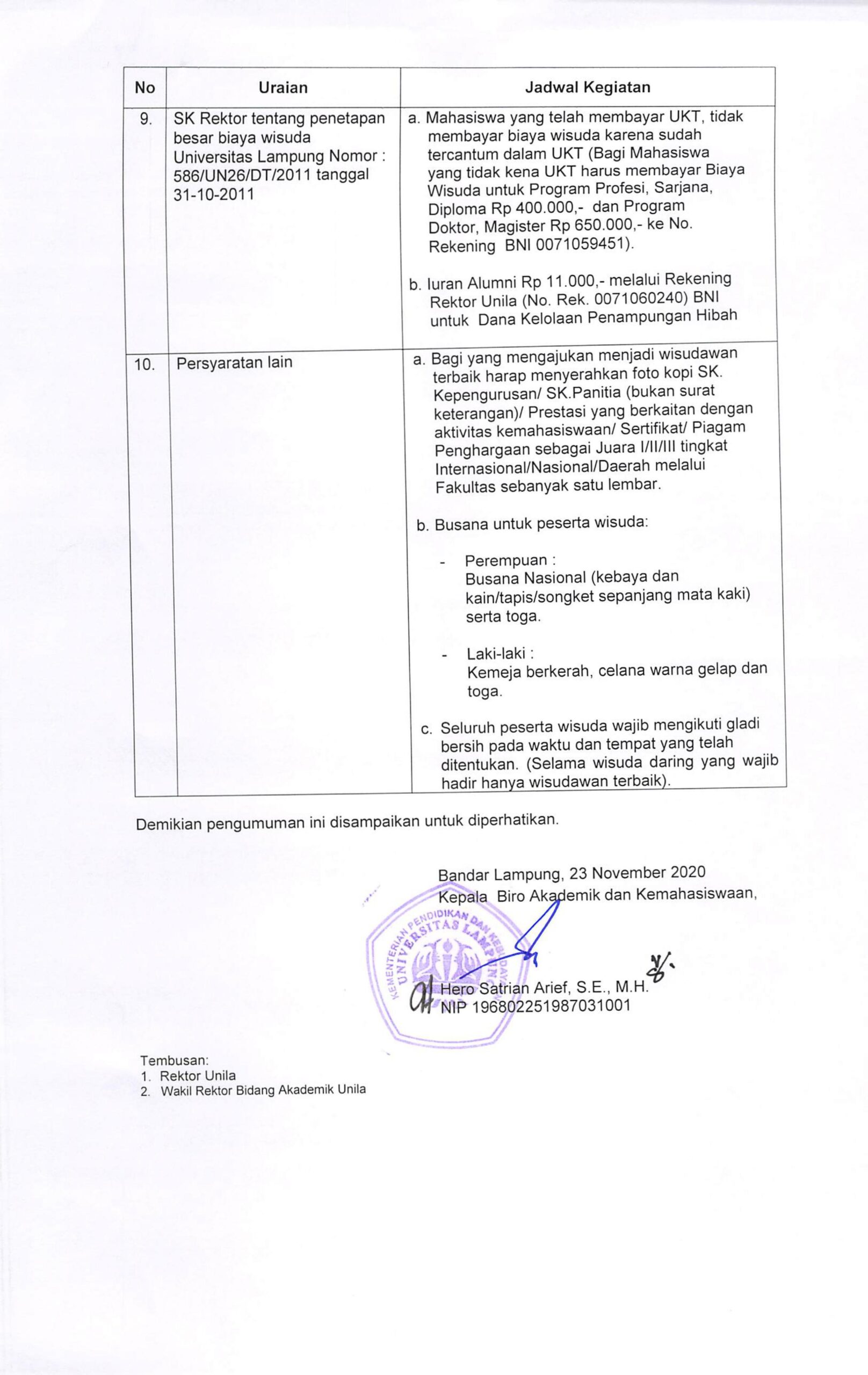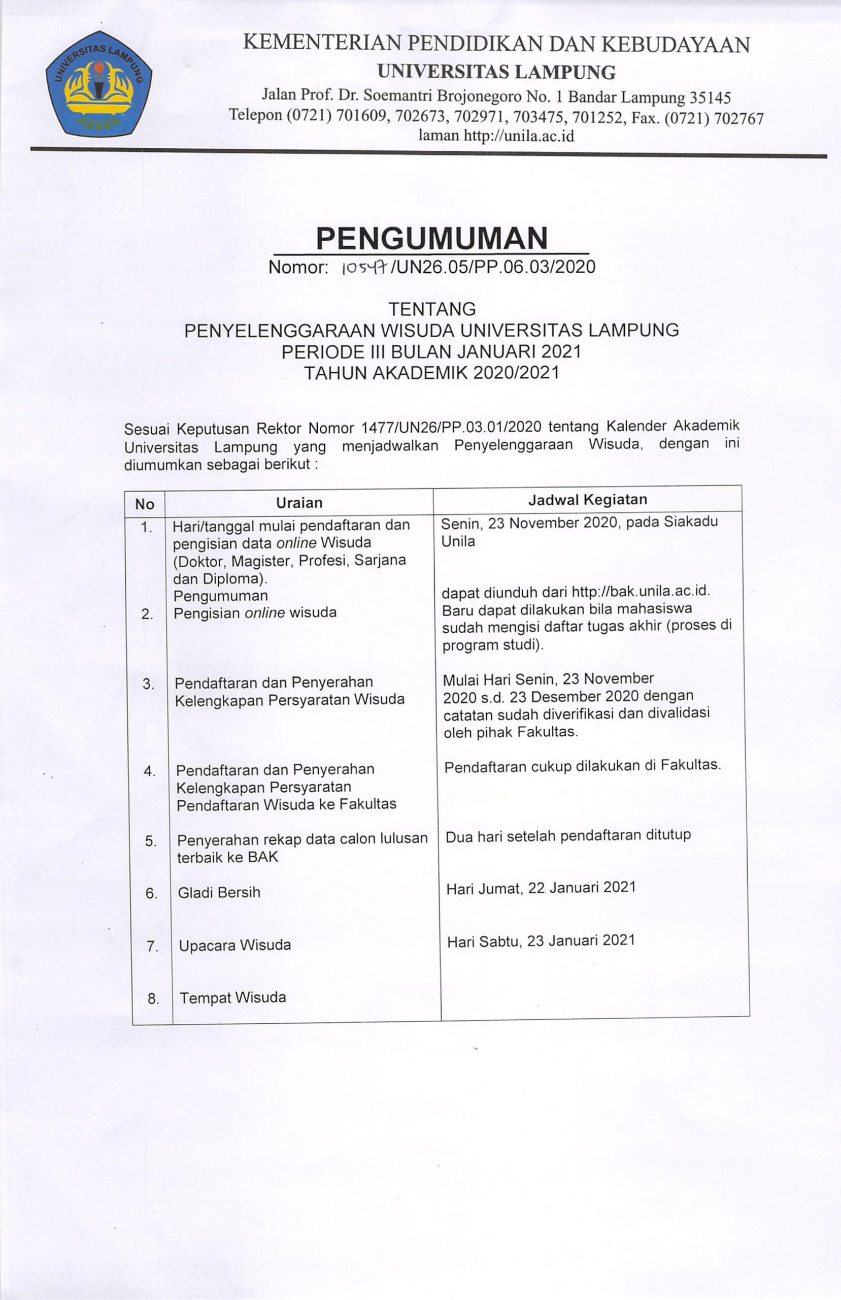 Pengumuman Penyelenggaraan Wisuda Universitas Lampung Periode III Bulan Januari 2021 Tahun Akademik 2020/2021 Pengumumuman 8 Desember 20208 Desember 2020 Admin PSPWK